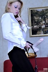 Angry blonde rams a huge strapon into her pussy guy before kicking him out
